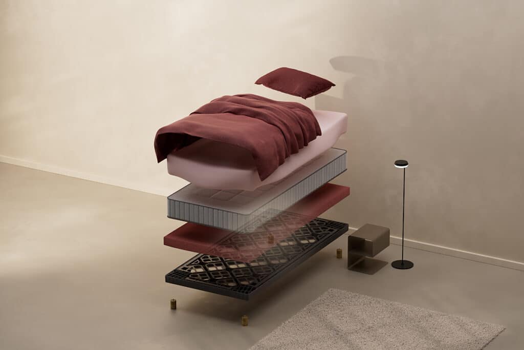 Neonest est le premier sommier entièrement circulaire au monde, intégralement fabriqué à partir de déchets post-consommation. « Aucune matière première nouvelle n’est utilisée, mais plutôt des bouchons de bouteilles, des emballages alimentaires, des meubles de jardin et des pare-chocs recyclés », explique Aaron Soenens, project & export sales chez Revor. « De plus, il est également recyclable à 100 %. Vous n’avez plus besoin du sommier ? Il est alors possible de le rapporter et les matières premières de votre Neonest peuvent être entièrement réutilisées. »